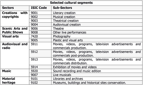In order to identify the cultural segment of businesses, we used as reference the Culture Satellite Account classification, a survey that measures the economic impact of the cultural industry in Colombia every two years. This classification proposes a division by cultural sectors and sub-sectors, according to the Classification codes of the International Standard Industrial Classification of all Economic Activities (ISIC) (DANE, 2018). Taking into account the findings from previous researches (Acosta, 2011; Espinosa-Espinosa, Abello-Vives, Ruz-Rojas and Alvis-Arrieta, 2012), six sectors and sixteen sub-sectors were chosen in the Bolivar Department, based upon their relevance in the progress of the cultural field (see Table 1).